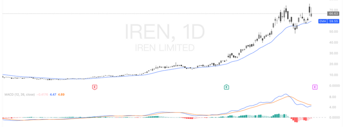 从日线图来看,IREN股价自2024年中启动强劲上升趋势,突破前期盘整区间后持续上行,近期在70美元附近遇阻回落,当前收于66.63美元,小幅回调但未跌破关键支撑。MACD指标虽出现红柱缩短、快慢线有收敛迹象,但仍处于零轴上方,显示买方动能尚未完全衰竭。整体技术结构显示,股价在经历快速上涨后进入阶段性整理,若能稳守59.55美元以上支撑位并重新站上70美元,则有望延续升势;反之,若有效跌破59.55或形成双顶形态,则需警惕回调风险。