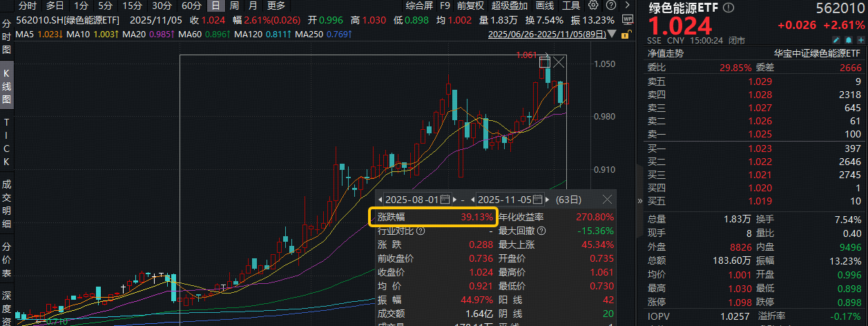热门ETF方面,全市场唯一一只跟踪绿色能源指数的绿色能源ETF(562010)午后大涨,场内涨幅盘中上探3.21%,收涨2.61%,拉长时间来看,该ETF自8月以来累计上涨39.13%,跑赢创业板指(35.99%),亦大幅跑赢沪深300(13.54%)、沪指(11.08%)等主要宽基指数。