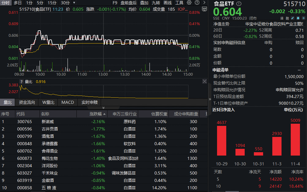 成份股方面,白酒及部分大众品跌幅居前。截至收盘,古井贡酒、酒鬼酒、舍得酒业、承德露露等多股跌超1%,贵州茅台、五粮液、泸州老窖等亦小幅收绿,拖累板块走势。