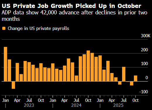 “你可以把原因归咎于贸易战,或是一系列其他因素,比如人工智能、先前偏紧的货币政策,以及政府停摆,但相当明显,劳动力市场仍然疲软,”BMO高级经济学家Sal Guatieri在ADP数据公布后的一份报告中说。“这可能是开启美联储在12月再次降息的关键。”