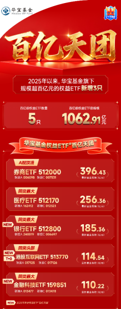 2025年,银行ETF(512800)、金融科技ETF(159851)、港股互联网ETF(513770)这3只热门ETF,基金规模先后升破100亿元大关。由此,华宝基金旗下跻身“百亿ETF俱乐部”的股票ETF数量增至5只,5只股票ETF的基金规模合计高达1062.91亿元。(数据来源:沪深证券交易所;时间截至2025.10.31)