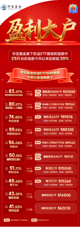 华宝基金旗下39只股票ETF跟踪的指数中,23只标的指数2025年以来回报超20%,其中7只标的指数2025年以来回报更是超过50%。(数据来源:Wind)