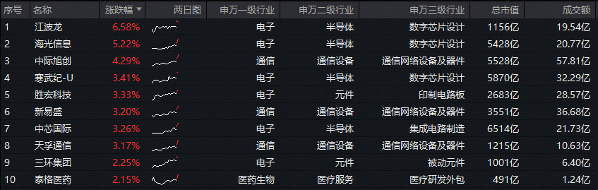 细分方向上,半导体和光模块携手大涨!半导体龙头方面,江波龙领涨超6%,海光信息涨逾5%,寒武纪涨超3%;光模块三巨头方面,中际旭创涨超4%,新易盛、天孚通信涨逾3%。