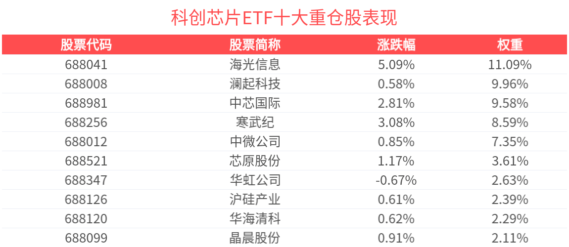 数据显示,截至2025年10月31日,上证科创板芯片指数前十大权重股分别为海光信息、寒武纪、澜起科技、中芯国际、中微公司、芯原股份、华虹公司、拓荆科技、佰维存储、沪硅产业,前十大权重股合计占比60.55%。