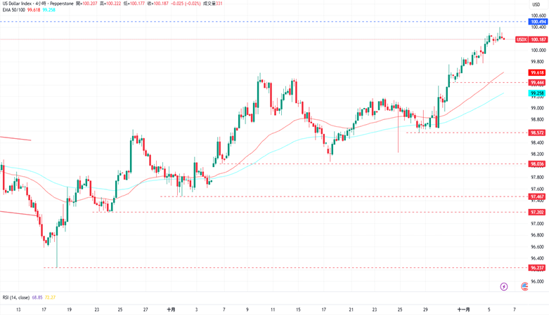CPT Markets分析师指出,美元指数继续延续自98.069的上涨趋势,准备测试100.494的关键阻力水平,但RSI指标持续位于70的超买水平上方,须注意回落的可能。上涨方面,美元指数目前的阻力为11月5日的高点100.397,再来是5月29日的高点100.494。下跌方面,美元指数目前的支撑为11月4日的低点99.772,接着是10月31日的低点99.444。