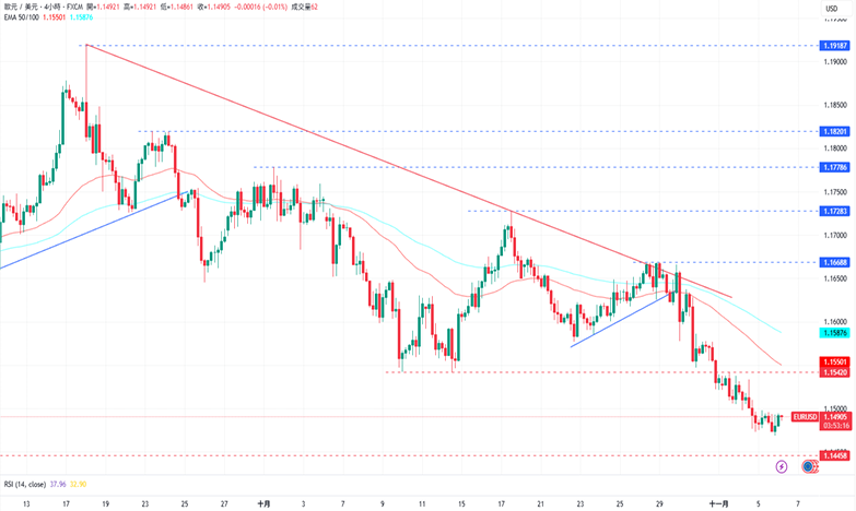 周三,欧元/美元上涨至1.14921美元。欧元区方面,10月服务业PMI指数显示欧元区与德国服务业活动均加速扩张,结果均优于市场预期,不过,欧元区9月PPI月率为-0.1%,低于预期的持平。美国方面,当日公布的数据显示,美国10月ADP就业人数增加4.2万人,高于市场预期的2.8万人。美国10月ISM非制造业PMI从9月的50上升至52.4,优于预期的50.8。由于美国政府停摆已进入第五周,在缺乏官方数据的情况下,这两项数据格外受到关注。周四,美国将公布10月挑战者企业裁员人数报告,而欧元区将公布德国9月季调后工业产出月率以及欧元区9月零售销售数据。