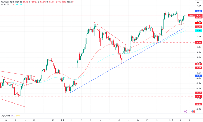 周三,美元/日元上涨至154.106日元。根据日本央行公布的9月货币政策会议纪要,委员们一致认为当前实际利率仍处于极低水平,若经济与物价展望如预期发展,央行可能会继续升息。其中一位委员指出,尽管升息条件正逐步具备,但目前不宜贸然行动,以免令市场感到意外。美国方面,当日公布的数据显示,美国10月ADP就业人数增加4.2万人,高于市场预期的2.8万人,前值则自-3.2万人修正为-2.9万人。美国10月ISM非制造业PMI从9月的50上升至52.4,优于预期的50.8。展望后市,周四美国将公布10月挑战者企业裁员人数报告,而日本将公布10月综合与服务业PMI指数终值。