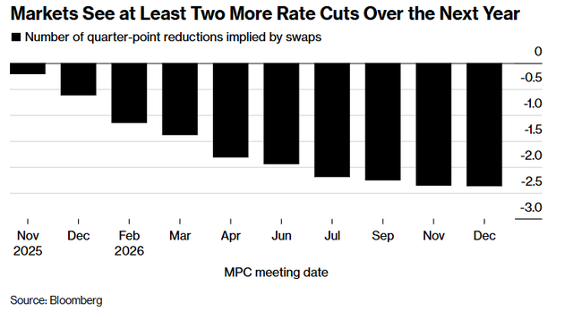 由于对高企的通胀以及工党政府将于11月26日公布的关键秋季预算仍存担忧,货币政策委员会(MPC)预计将采取谨慎态度。然而,鉴于近期数据显示价格压力有所缓解且经济正在降温,贝利可能会保留在圣诞节前采取行动的希望,他被视为这个意见分歧的委员会中的关键摇摆票。