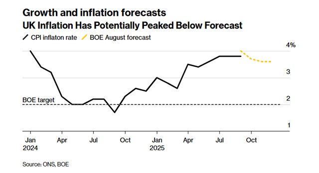 在9月份物价增长出人意料地保持在3.8%之后,大多数经济学家预计英国央行将下调其近期通胀预测。该央行此前曾预计当月通胀率将达到4%的峰值。