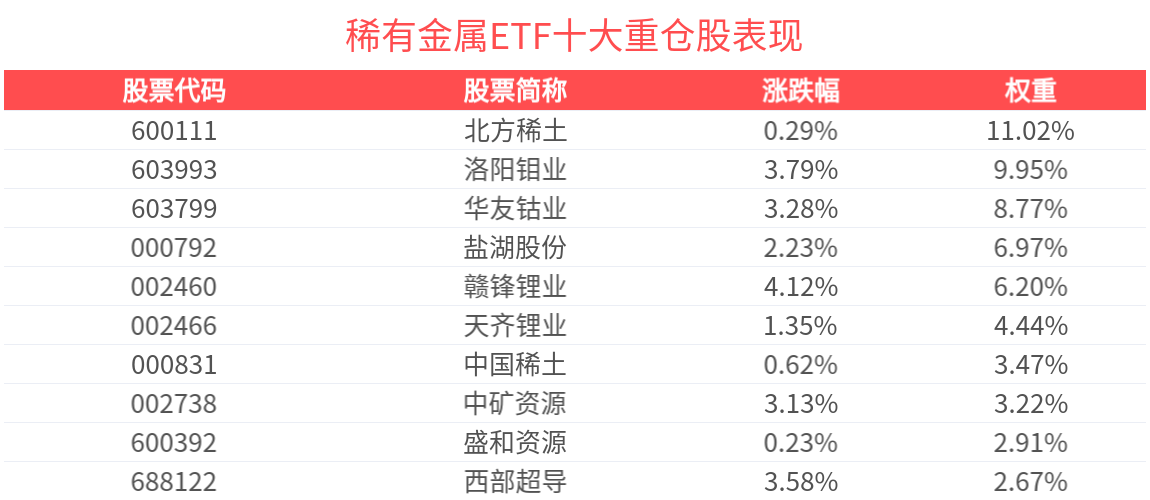 数据显示,截至2025年10月31日,中证稀有金属主题指数前十大权重股分别为北方稀土、洛阳钼业、华友钴业、盐湖股份、赣锋锂业、天齐锂业、中矿资源、中国稀土、西部超导、厦门钨业,前十大权重股合计占比60%。