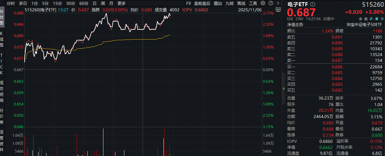 盘面上,11月6日,超142亿主力资金涌入电子板块,板块吸金额高居31个申万一级行业第二位!热门ETF方面,布局电子板块核心资产的电子ETF(515260)场内涨幅一度上探3.15%,现涨3%,盘中收复5日、20日均线