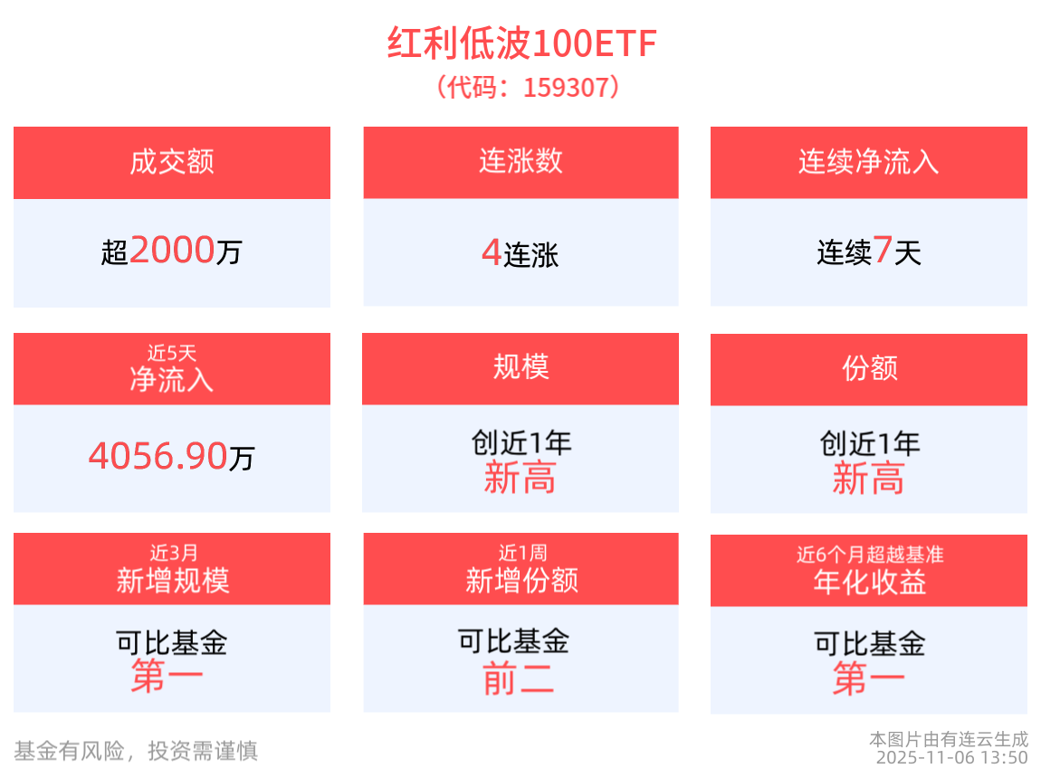 截至2025年11月6日 13:50,中证红利低波动100指数上涨0.54%,成分股云天化上涨10.00%,新疆众和上涨4.63%,特变电工上涨4.52%,华域汽车上涨3.21%,广州发展上涨2.97%。红利低波100ETF(159307)上涨0.73%, 冲击4连涨。最新价报1.11元。拉长时间看,截至2025年11月5日,红利低波100ETF近1周累计上涨1.29%。