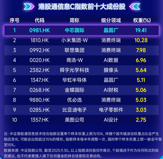 港股信息技术ETF(159131)标的指数由“70%硬件+30%软件”构成,重仓港股“半导体+电子+计算机软件”,涵盖41只港股硬科技公司,其中中芯国际权重达19%,小米集团-W权重10.28%,华虹半导体权重5.11%;不含阿里巴巴、腾讯、美团等大市值互联网企业,锐度更高,更易捕捉港股AI硬科技行情。