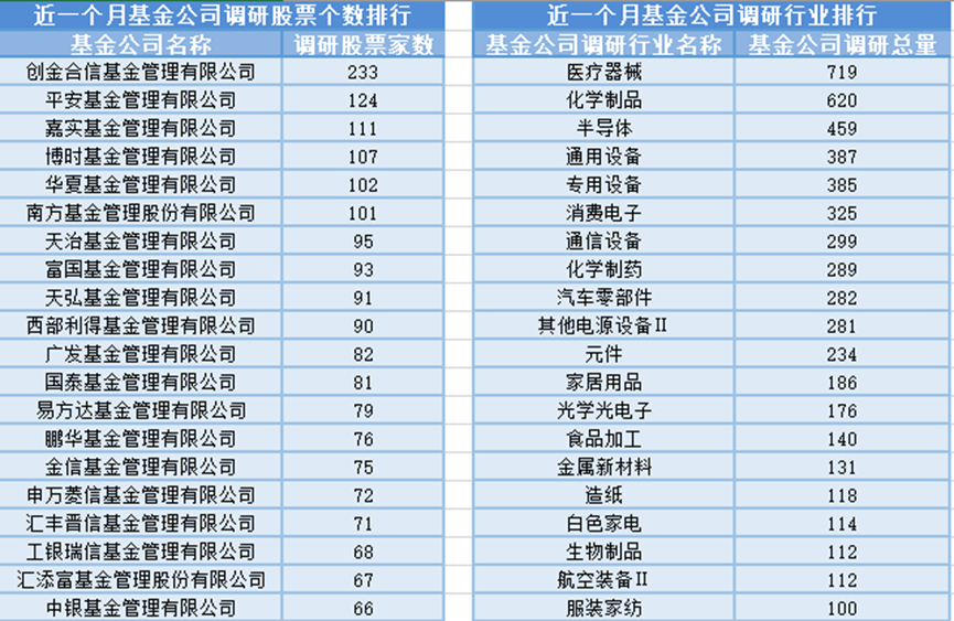 近一个月(10月7日-11月6日),创金合信基金参与公司调研的数量最多,共调研233家上市公司,然后调研较为活跃的还有平安基金、嘉实基金和博时基金,分别调研124家、111家、107家上市公司;从调研行业上来看,基金公司对医疗器械行业的上市公司调研次数最多,共有719次,其次是化学制品行业,基金公司调研了620次。