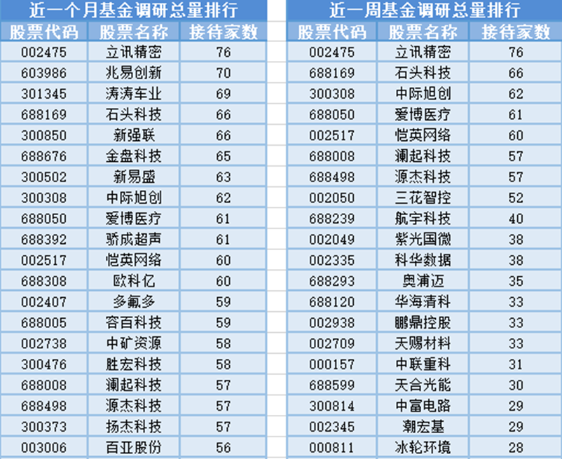 将时间周期缩短到最近一周(10月30日-11月6日)来看,基金调研数量第一的公司是立讯精密,属于消费电子行业,主营业务为从事消费电子、通信及数据中心、汽车、医疗等领域相关零组件、模组及系统集成业务。共被76家基金机构调研,然后被调研数量较多的股票是石头科技、中际旭创和爱博医疗,分别接受66家、62家和61家基金机构的调研。