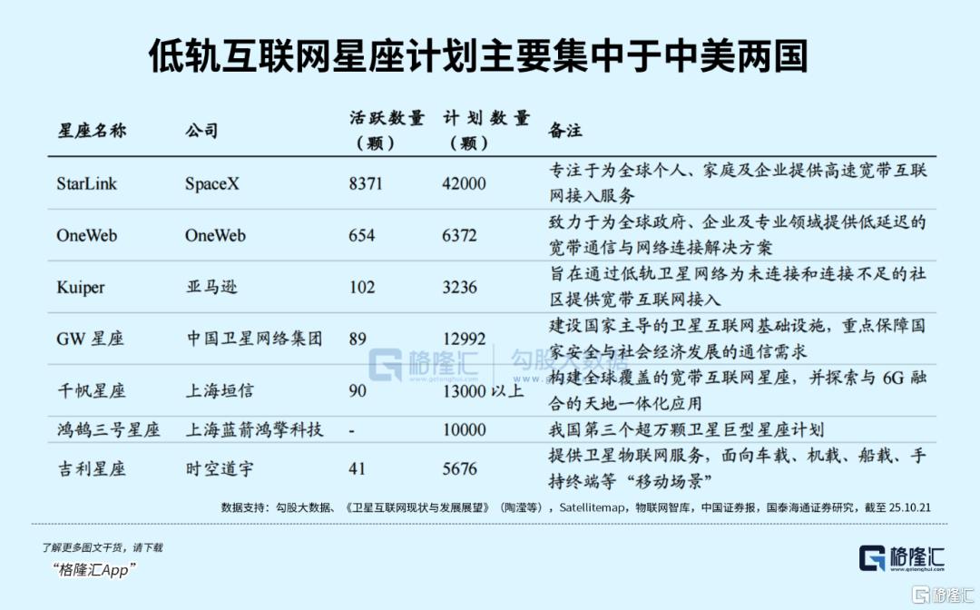 低轨卫星的轨道和频段资源是“先到先得”的稀缺品,全球可利用低轨资源有限,当前中美已占据绝对主导:美国星链在轨卫星达8371颗,占全球89.6%,规划总量超4.2万颗;中国不甘示弱,星网GW星座、千帆星座合计规划2.5万颗,2027年前将完成数千颗部署,是唯一能在规模上与美国抗衡的国家。这种“资源抢滩战”直接推动产业链加速,卫星制造、火箭发射产能持续释放。