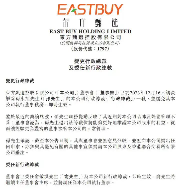 2023年12月17日晚间,东方甄选在港交所公告称,董事会已于12月16日议决解除孙东旭的行政总裁一职,并罢免其公司执行董事职务,即时生效。董事会已委任俞敏洪为公司新行政总裁,即时生效。俞先生将继续出任董事会主席,并将调任为本公司执行董事。