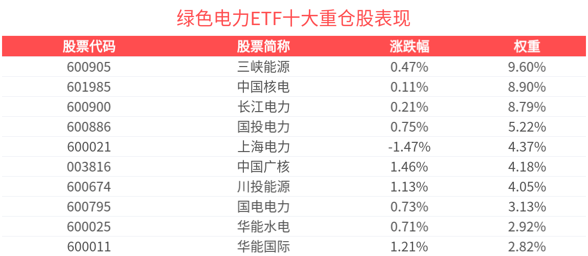 数据显示,截至2025年10月31日,国证绿色电力指数前十大权重股分别为三峡能源、中国核电、长江电力、上海电力、国投电力、中国广核、川投能源、国电电力、华能国际、华能水电,前十大权重股合计占比56.15%。