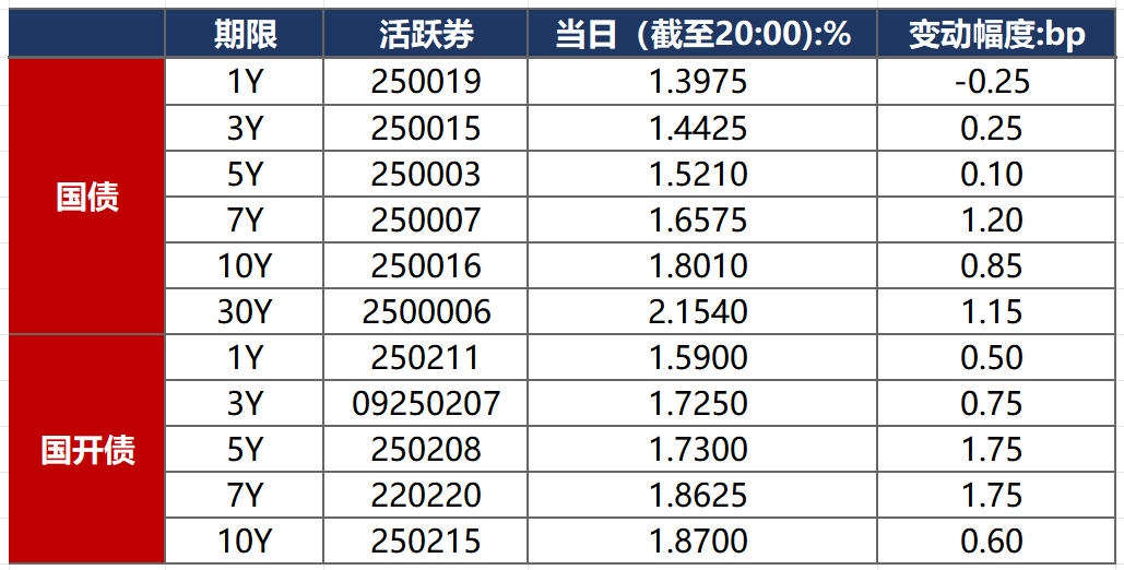 11月6日,受股市上涨以及公募债基赎回费率新规将落地传闻压制,债市震荡调整。截至北京时间20:00,10年期国债活跃券250016收益率上行0.85bp至1.8010%,10年期国开债活跃券250215收益率上行0.60bp至1.8700%。