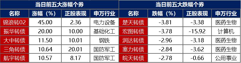 【转债市场主要指数集体跟涨】 11月6日,转债市场跟随权益市场继续上行,当日中证转债、上证转债、深证转债分别收涨0.53%、0.48%、0.60%。当日,转债市场成交额794.55亿元,较前一交易日放量90.26亿元。转债市场个券多数上涨,406支转债中,276支收涨,118支下跌,12支持平。当日上涨个券中,新上市锦浪转02涨超45%,振华转债涨停20%,大中转债涨超11%;下跌个券中,楚天转债、宏图转债跌逾3%。