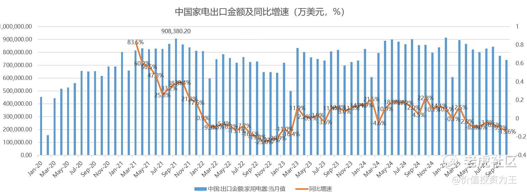 像家电,今年10月出口额为74亿美元,同比下滑13.6%,下滑幅度创2023年2月以来记录: