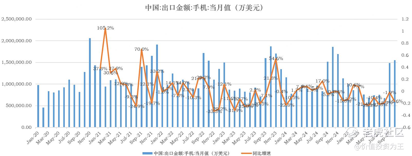 10月手机出口金额155亿美元,同比下滑16.6%: