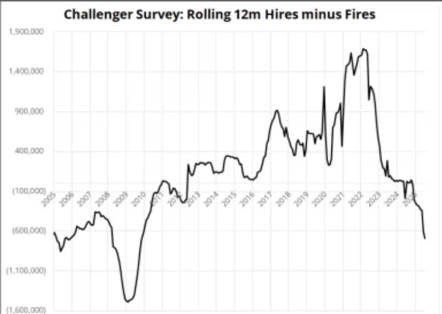 “如果你信奉‘就业厄运’,那么这张图表就是一场洪水即将来临的预言,”唐纳利在报告中表示。诚然,Challenger数据有其缺陷。唐纳利指出,该数据未经过季节性调整,而且可能比劳工部发布的官方非农就业报告波动性大得多。“我更相信非农数据,但我们现在没有非农数据,”他补充道。