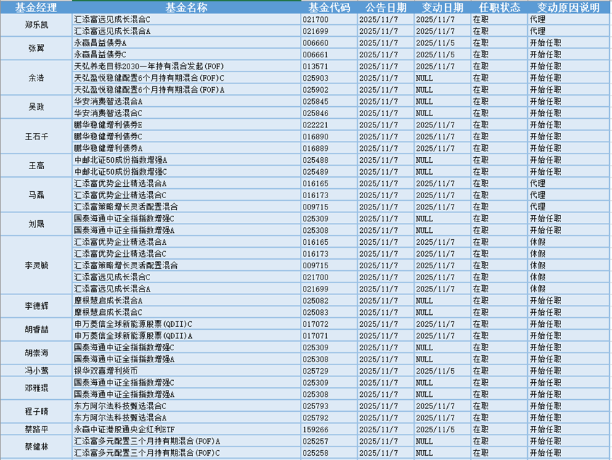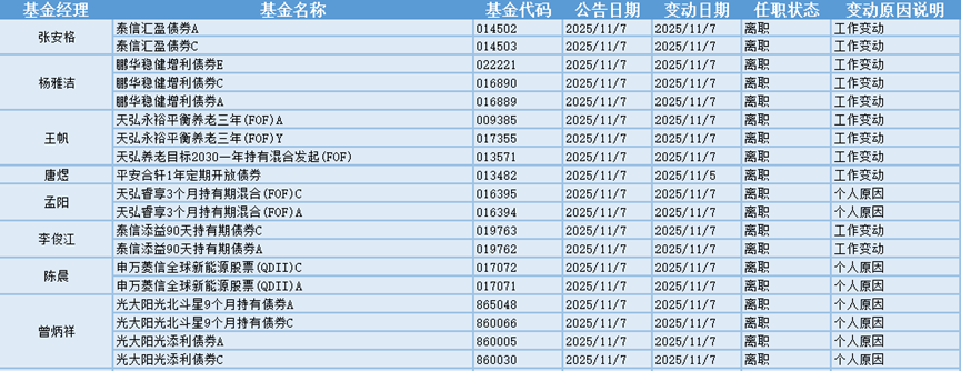 根据巨灵统计的数据显示,近30天(10.8-11.7)共有519只基金产品的基金经理发生离职变动。其中今天(11.7)有19只基金产品发布基金经理离职公告,从变动原因上来看,有5位基金经理是由于工作变动而从管理的11只基金产品中离职,有3位基金经理是由于个人原因而从管理的8只基金产品中离职。