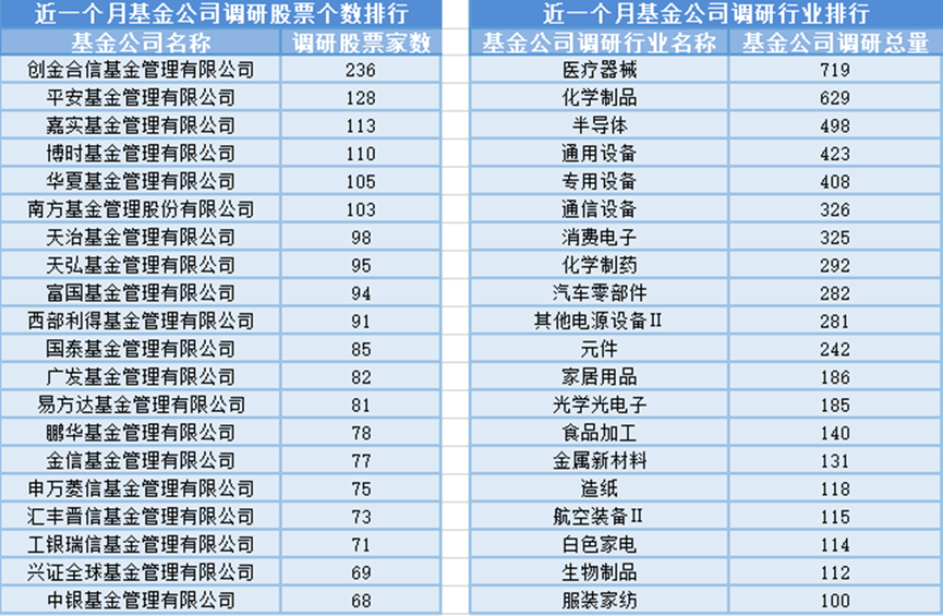 近一个月(10月8日-11月7日),创金合信基金参与公司调研的数量最多,共调研236家上市公司,然后调研较为活跃的还有平安基金、嘉实基金和博时基金,分别调研128家、113家、110家上市公司;从调研行业上来看,基金公司对医疗器械行业的上市公司调研次数最多,共有719次,其次是化学制品行业,基金公司调研了629次。