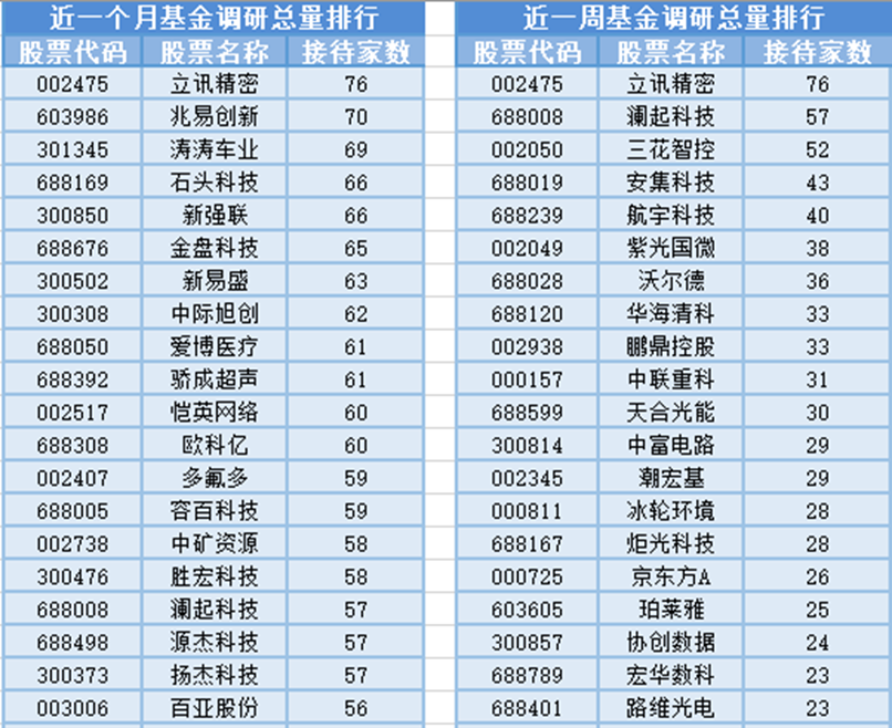 将时间周期缩短到最近一周(10月31日-11月7日)来看,基金调研数量第一的公司是立讯精密,属于消费电子行业,主营业务为从事消费电子、通信及数据中心、汽车、医疗等领域相关零组件、模组及系统集成业务。共被76家基金机构调研,然后被调研数量较多的股票是澜起科技、三花智控和安集科技,分别接受57家、52家和43家基金机构的调研。