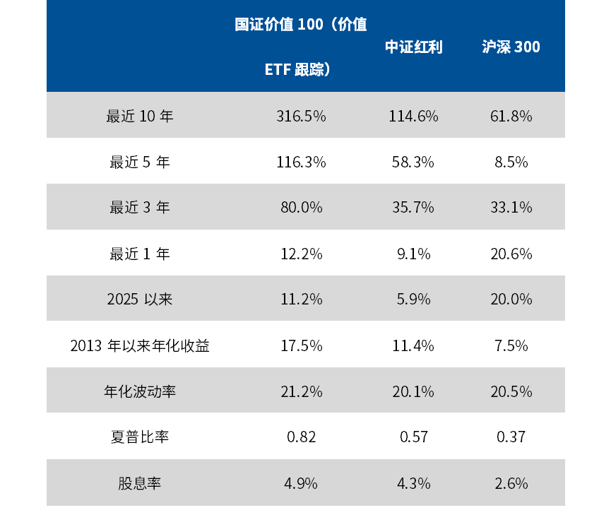从收益表现上看,截至2025年10月21日,国证价值100指数近12年年化收益17.5%,远高于中证红利的11.4%,而若将指数收益进一步拆解为盈利增长、估值变化和股息收益可以发现,二者虽均具备高股息特性,但中证红利指数过度依赖分红单一因子,盈利增长贡献不足,而国证价值100指数通过三重筛选,不仅实现了“ 增长+估值+分红 ” 的均衡收益结构,在股息率上也有不输中证红利的表现。
