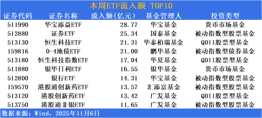 本期(2025年11月3日-11月6日),在板块内部轮动显著加速与长期低利率并存的市况下,市场资金对避险属性的强化及确定性收益渠道的配置诉求持续显现。兼具稳定股息回报与优质资产特征的红利类资产,其长期配置价值逻辑仍具有较强支撑力。华宝添益ETF(511990)流入近30亿,位居流入榜第一。证券ETF(512880)流入超35亿、恒生科技ETF(513130)流入超20亿,位居二、三。