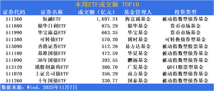 成交额方面,短融ETF(511360)、周成交额破千亿,达1697.24亿,位居列周成交榜首位;银华日利ETF(511880)、华宝添益ETF(511990)周成交额达875.29亿、663.35亿,分居二、三,债券类基金场内交投保持较高活跃度。