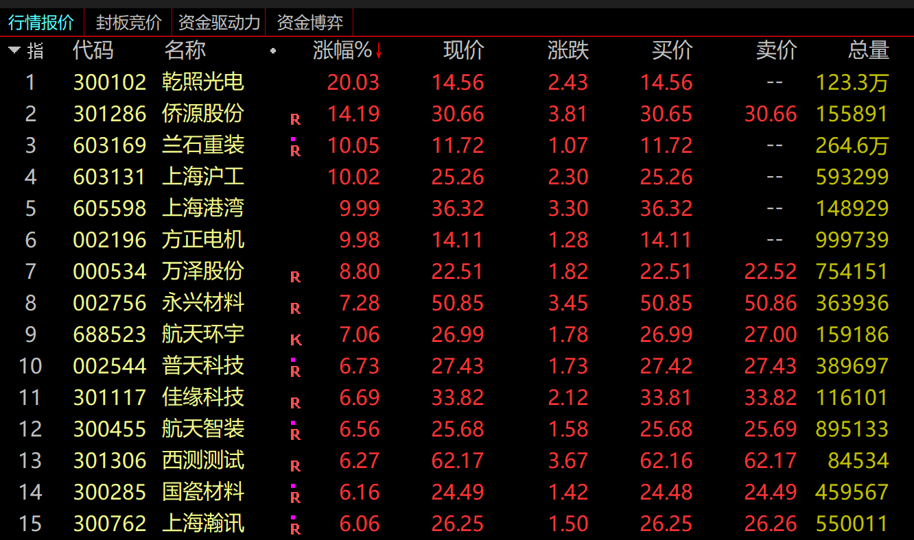 近期在资本市场,军工板块表现活跃,交易所数据显示,今日板块内多只个股涨停,乾照光电20.03%涨停(今日首板),兰石重装10.05%涨停(7天4板),上海沪工10.02%涨停(今日首板),深圳新星10.0%涨停(2天2板),侨源股份涨14.19%,孚日股份涨9.97%(2天2板),万泽股份涨8.8%,永兴材料涨7.28%等。