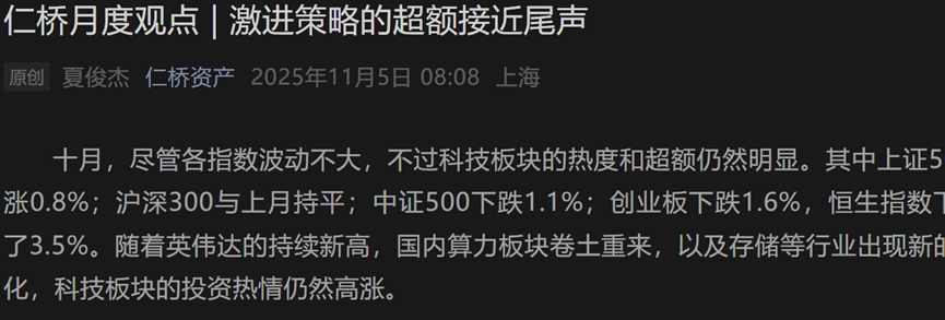 近日,仁桥资产夏俊杰在公众号发表月度观点,夏俊杰表示,十月,各指数波动不大,但科技板块热度与超额收益显著。科技泡沫的产生有其必然性,中美博弈下中国科技突破被赋予战略价值,美国AI投资火热也带动国内相关企业受益,而国内地产和消费低迷,政策对冲不强烈,使得市场资金流向科技板块。然而,当前科技泡沫与历史上的互联网泡沫等并无本质区别,投资者需警惕。中美关税问题缓和,中国应对出色,关税战负面影响边际减小,稳定外部环境将成中国资产修复动力。此外,十五五规划建议出台,强调现代化产业体系、科技创新及民生问题。回到股市,激进策略超额或近尾声,投资者需理性看待科技热潮。