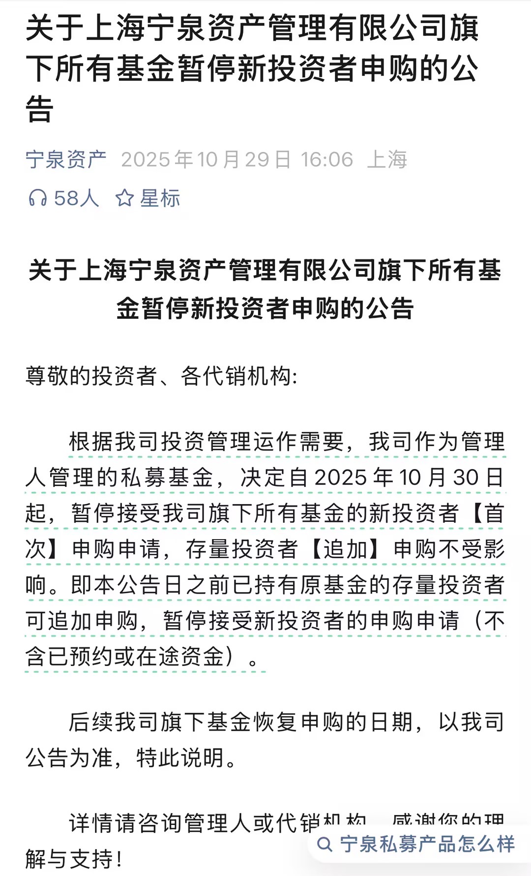 宁泉资产“闭门谢客”:旗下基金暂停新投资者申购