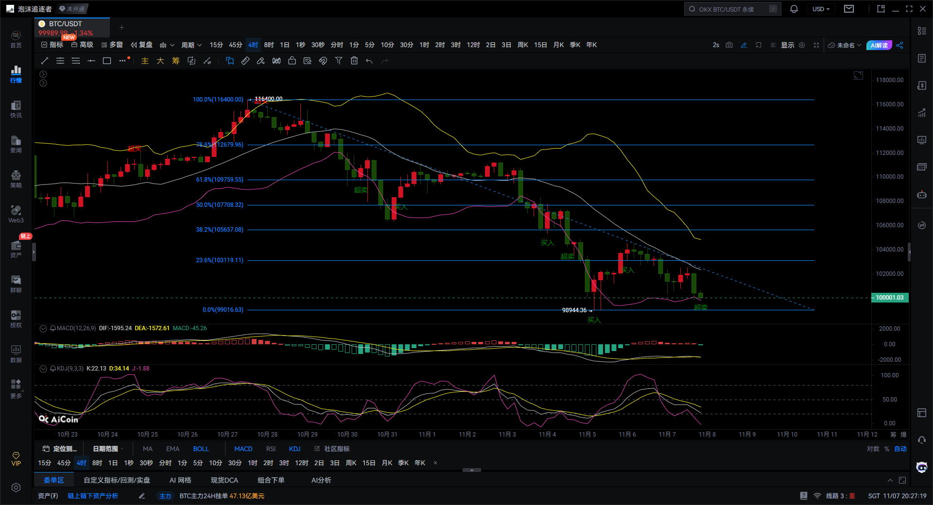 综合分析,短期1到3天内,价格多次测试99000美元支撑未破,下跌动能衰竭,MACD和KDJ指标显示反弹可能,目标依次为103000和105500。若放量突破105500,可挑战107000趋势线。中期3到7天,若反弹无力突破105000至10600元的下降趋势线,行情将维持震荡筑底。若跌破99000支撑,可能下探97000至95000区间。