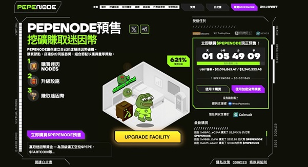 此模式不仅降低挖矿门坎,也为迷因币增加实际参与场景。在经济模型方面,Pepenode的预售参与者可获得极高的年化回报,平均估值逾22300%。此外,早期玩家能解锁更高等级的Miner Nodes,使代币产出更具竞争力。