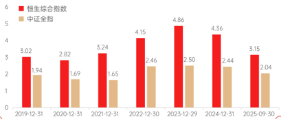 从数据来看,港股的股息率优势尤为显著。2019-2025年9月期间,恒生综合指数平均股息率达4.15%,而同期中证全指平均股息率仅2.28%,港股股息率长期高于A股近2个百分点。即便在2025年9月市场阶段性调整后,恒生综合指数股息率仍达3.15%,远超中证全指的2.04%(数据来源:Wind,截至2025/9/30)。
