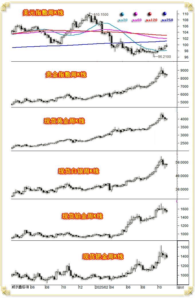 wellxin贵金指数(金银钯铂)以8493.57点开盘,最高上试8598.90点,最低下探8230.87点,报收8419.90点,下跌74.07点,跌幅0.87%,振幅4.33%,周K线呈先抑后扬,调整抵抗小阴线。