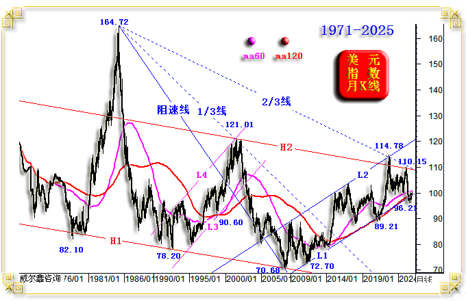 为何笔者认为即便2/3线支撑被击穿,仍不宜惯性杀跌呢?因为下方紧临美元2022年见顶114.78点后的中长期下行通道H1H2之轨道线H2支撑。