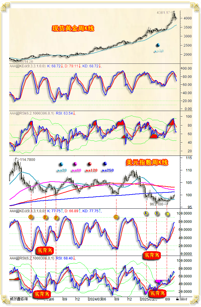 中期趋势,如美元、金价周线通用指标图示: