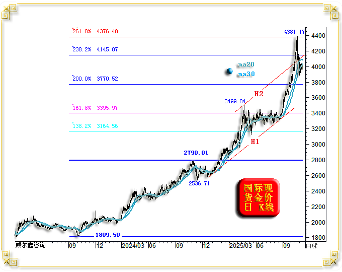 但由于金价在5-8月的上升三角形整理极其充分,比2024年任何一次中继整理都充分,致使金价突破之后的力度非常强,周线九连阳一气呵成精确测试了261.8%黄金分割位阻力,非常精确。理论位在4376.48美元,实际金价最高上试4381.17美元。