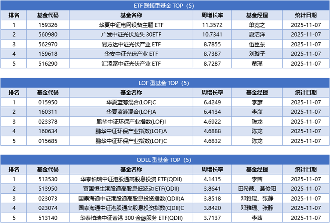 单基金方面,剔除掉创新封基类型基金的影响,上周业绩表现最好的基金为东方阿尔法科技甄选混合A,周涨跌幅为14.6829%,为混合型基金;分基金类型看,同样剔除掉分级杠杆及固定收益两类基金的影响,股票型基金冠军为汇添富中证光伏产业指数增强发起式A,周涨跌幅为9.5396%;债券型基金冠军为工银平衡回报6个月持有期债券A,周涨跌幅为2.3534%; 混合型基金冠军为东方阿尔法科技甄选混合A,周涨跌幅为14.6829%; 货币型基金冠军为红土创新优淳货币B,周涨跌幅为0.0417%;ETF型基金冠军为华夏中证电网设备主题ETF,周涨跌幅为11.3572% ;LOF型基金冠军为华夏蓝筹混合(LOF)C,周涨跌幅为6.4249%;QDII基金冠军为华泰柏瑞中证港股通高股息投资ETF(QDII),周涨跌幅为4.1415%;下面是不同类型基金周涨跌幅TOP5 (剔除掉分级基金的影响)