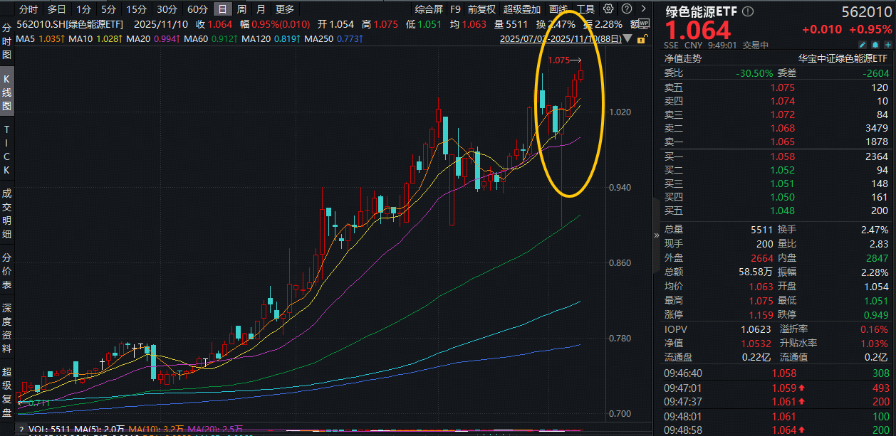 今日(11月10日)全市场唯一一只跟踪绿色能源指数的绿色能源ETF(562010)延续上周攻势,场内价格盘中涨近2%,现涨0.95%,冲击日线4连涨,上探2023年2月以来的高点!