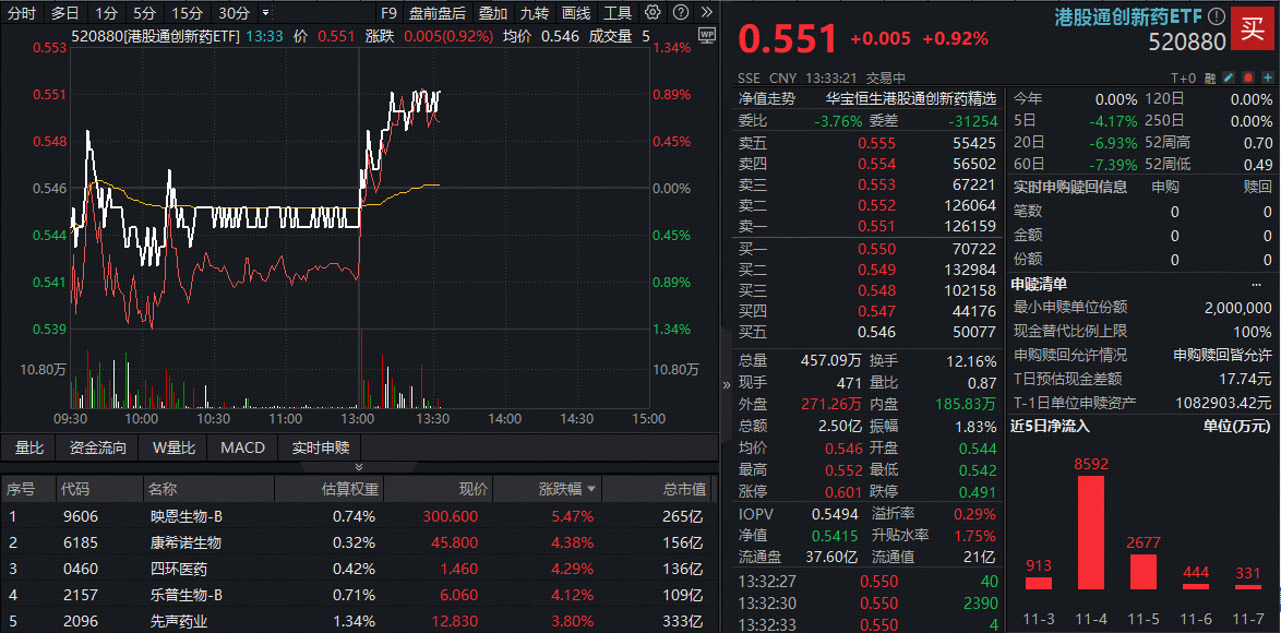 港股通创新药板块午后直线拉升翻红,高人气港股通创新药ETF(520880)上探1%,所覆盖的37家创新药研发类公司多数飘红,映恩生物-B、乐普生物-B、康希诺生物等多股涨超4%。近期资金连续进场低吸,520880上周累获1.3亿元资金净申购。