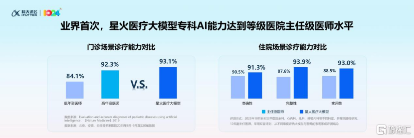 同时,大模型能力也向等级医院复杂场景进阶,在门诊场景中诊断准确率达93.1%,显著超越低年资医师水平,更优于高年资医师水平。在住院场景这一病情更为复杂的领域,星火医疗大模型在诊断准确性、完整性和实用性等核心指标上表现优异,专科AI能力在业界首次达到等级医院主任级医师水平。