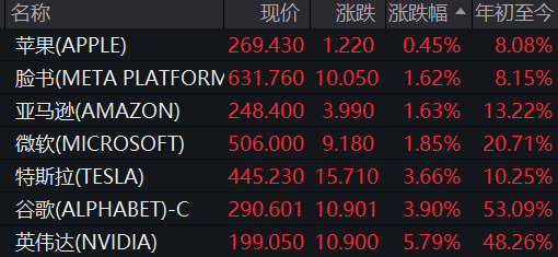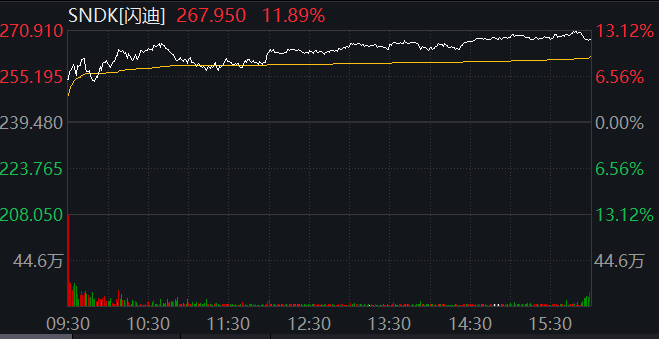 随着市场风险偏好回升,英伟达、Palantir等重量级人工智能概念股领涨。英伟达大涨5.8%,Palantir飙升8.8%,特斯拉涨3.7%,谷歌A涨4%,微软涨1.85%,亚马逊涨1.63%。值得注意的是,闪迪在最新闪存提价消息推动下,单日暴涨12%,股价创历史新高,今年迄今该股已上涨超过400%。