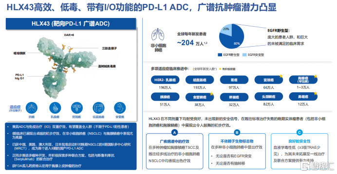 根据高盛预测,“HLX43作为一款兼具ADC精准杀伤与免疫疗法激活机制的抗PD-L1 ADC药物,到2036年有望实现风险调整后销售额38亿美元,贡献公司估值的约54%。特别是在二线EGFR野生型非鳞状非小细胞肺癌领域,HLX43展现出显著的商业化潜力。