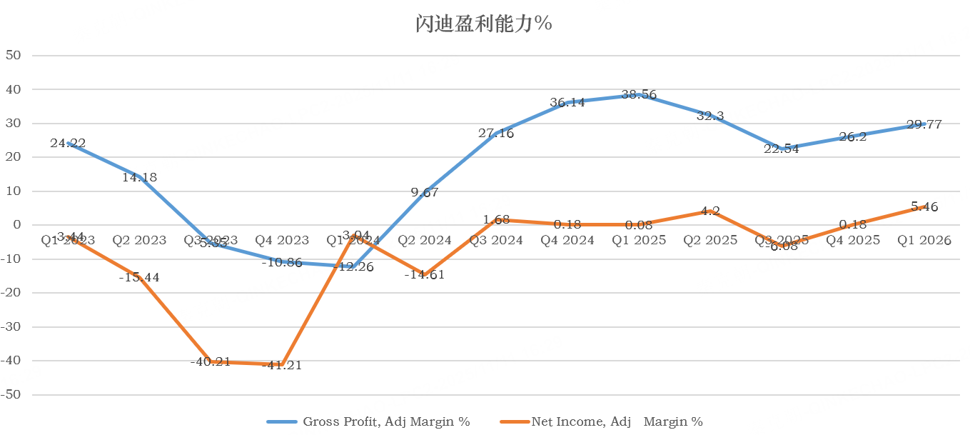 存储公司有极强的周期属性,在行业低迷或正常状态时,由于竞争关系,盈利能力较差,以闪迪为例,今年二季度(对应25财年四季报)的毛利率只有26.2%,调整后净利率只有可怜的0.18%:
